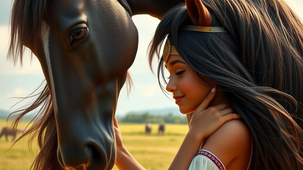 A charming Indian girl with flowing hair gently embracing the face of a majestic horse, their eyes reflecting a deep bond of trust and affection amidst a serene countryside setting.