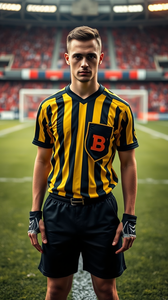A charming individual dressed in an authentic football referee outfit stands confidently centered on a vibrant football field. They gaze directly at the viewer, captured in a striking portrait photograph. The image boasts remarkable photo-realism with intricate skin details and an 8k resolution. Every element is enhanced by diffused soft lighting and a shallow depth of field, capturing sharp focus and cinematic, hyperrealistic CGI lighting. The composition excludes any imperfections or distortions, ensuring anatomical accuracy and harmonious proportions, resulting in a compelling full-length frame.