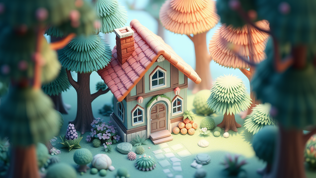 A charming isometric fantasy cottage nestled in an enchanting forest, finely detailed with intricate designs, bathed in gentle, smooth lighting. The scene features an array of soft pastel colors, rendered in a 100mm lens style using 3D Blender. This whimsical creation is inspired by trending styles on Polycount, embodying a playful modular constructivism with a serene blue backdrop. Enhanced by physically based rendering, the cottage is perfectly centered amidst volumetric light, giving it a dreamy cartoon-like and anime-inspired appearance. The render captures the essence of low resolution with normal quality emphasis, bringing forth a cozy, storybook charm.