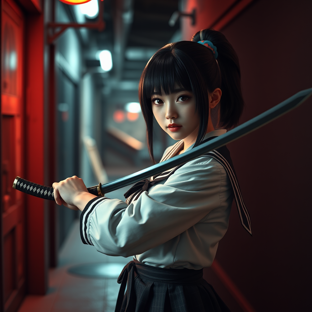 A charming Japanese high school girl dressed in a classic school uniform, confidently wielding a sleek katana in a shadowy alley. The scene has a cinematic flair, captured in a highly detailed 3D render powered by unreal engine, showcasing a 32k resolution. The aspect ratio is 9:16, with an emphasis on a vivid and expressive style, blending elements of realism and artistry to highlight her poised yet enigmatic presence in the dimly lit setting.