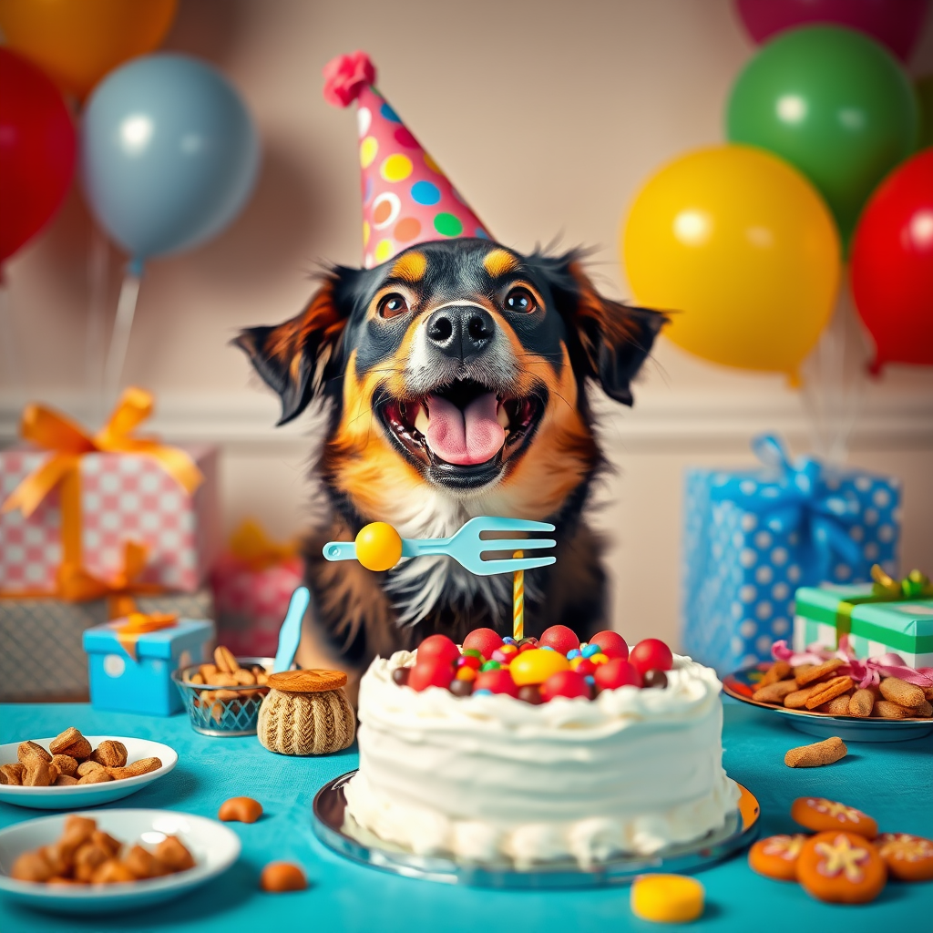 A charming, joyful dog with a colorful party hat on its head and a playful expression sits eagerly at a table. In its mouth is a whimsical toy fork. The table is adorned with a beautifully decorated cake and an array of dog treats. Around the room, vibrant balloons and wrapped gifts add to the festive cheer. The setting exudes a warm, inviting atmosphere, enhanced by studio lighting. The scene is filled with pleasant colors and intricate details, following the Rule of Thirds while incorporating an unexpected playful element.