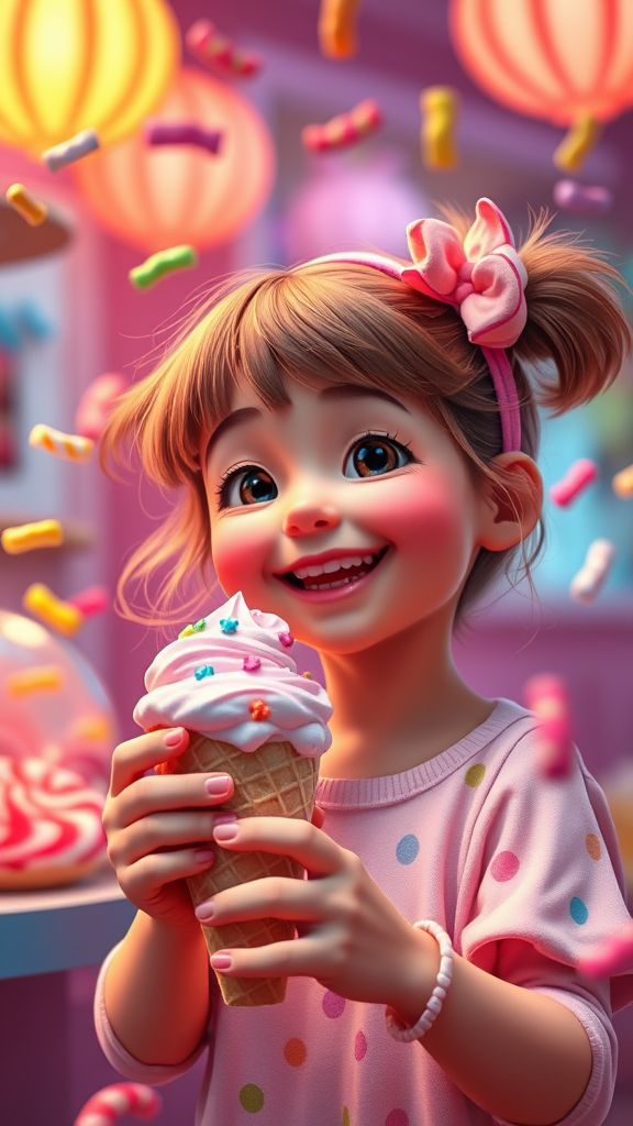 A charming, joyful girl enjoying a scoop of ice cream while colorful candies whirl about her in a whimsical dance, evoking a Pixar or Disney animated scene. The setting is illuminated with cinematic lighting that brings out vibrant colors, creating an enchanting 8k quality image. The atmosphere is infused with a playful magic and warmth, invoking feelings of love and wonder.