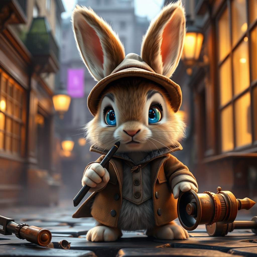 A charming, little fluffy baby bunny clad in a Sherlock Holmes outfit, with bright blue eyes, diligently investigating a mystery, set in an enchanting Old London backdrop. The scene is animated Pixar-style, showcasing ultra-detailed, photorealistic concept art. The atmosphere is brought to life with realistic, cinematic studio lighting, vivid colors, and perfect composition. The bunny appears in sharp focus amidst a soft, natural volumetric ambiance, rendered with exquisite detail in Unreal Engine, enhancing the magical, storytelling appeal.