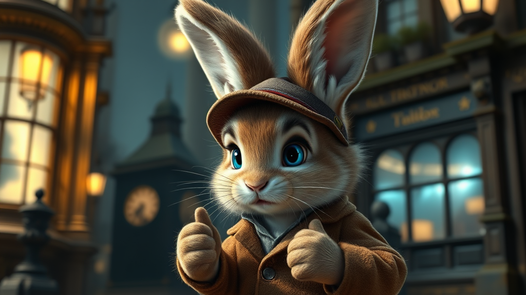 A charming little fluffy bunny cub dressed as Sherlock Holmes, with captivating blue eyes, engrossed in solving a mystery, set against an enchanting old London backdrop. Inspired by Pixar style, the scene is ultra-detailed; with vivid colors and a cinematic aura, the lights are meticulously realistic, reminiscent of a high-end studio photo. The composition is perfectly balanced, showcasing sharp focus and photorealistic concept art. The ambiance features soft, natural volumetric lighting, creating a cinematic feel as if rendered in a film studio. A touch of whimsy is added with a slightly mischievous expression on the bunny's face, enhancing the overall enchanting narrative.