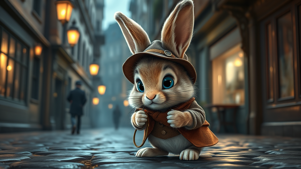 A charming little fluffy bunny cub, with striking blue eyes, dressed as a miniature Sherlock Holmes, investigates a mysterious crime in the cobblestone streets of old London. The scene bursts with Pixar-style animation, showcasing ultra-detailed, vibrant colors and realistic lighting that casts a soft glow on the historic architecture. The bunny's expressive face is captured in sharp focus, embodying a photorealistic concept art style. The backdrop of Victorian-era London adds depth, while cinematic elements create perfect composition. The soft, natural volumetric lighting envelops the scene in a magical aura, rendered meticulously in Unreal Engine to enhance the whimsical yet intense atmosphere of the investigation.