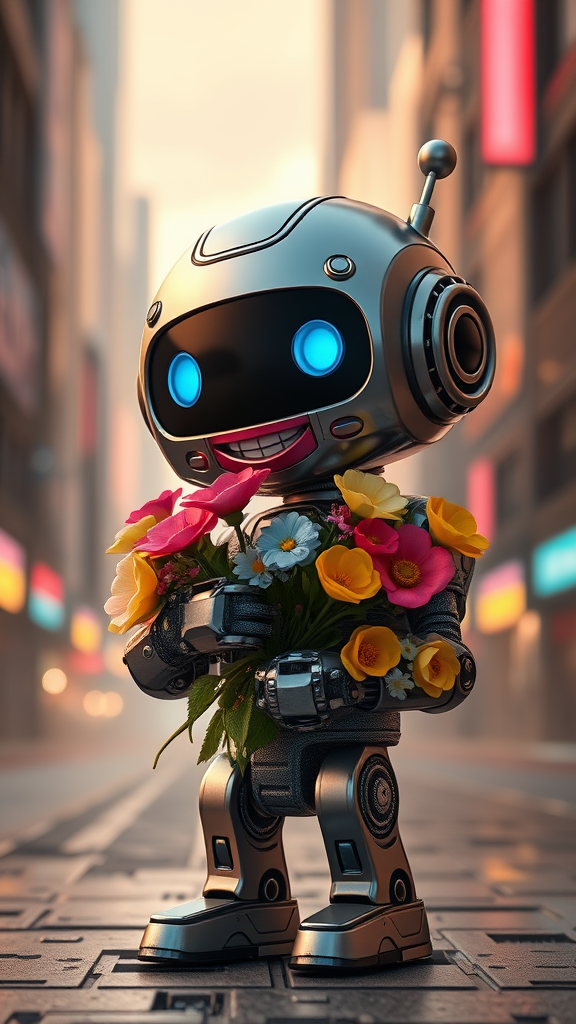 A charming little robot, designed with a Pixar-like style, cradling a bouquet of colorful flowers, set amidst a futuristic Tron-inspired cityscape. The scene is rich with hyper-detailed textures, showcasing gleaming metal surfaces and intricate circuitry. Volumetric lighting casts a warm, soft glow around the robot, highlighting its gleeful expression and the delicate petals of the flowers it holds.