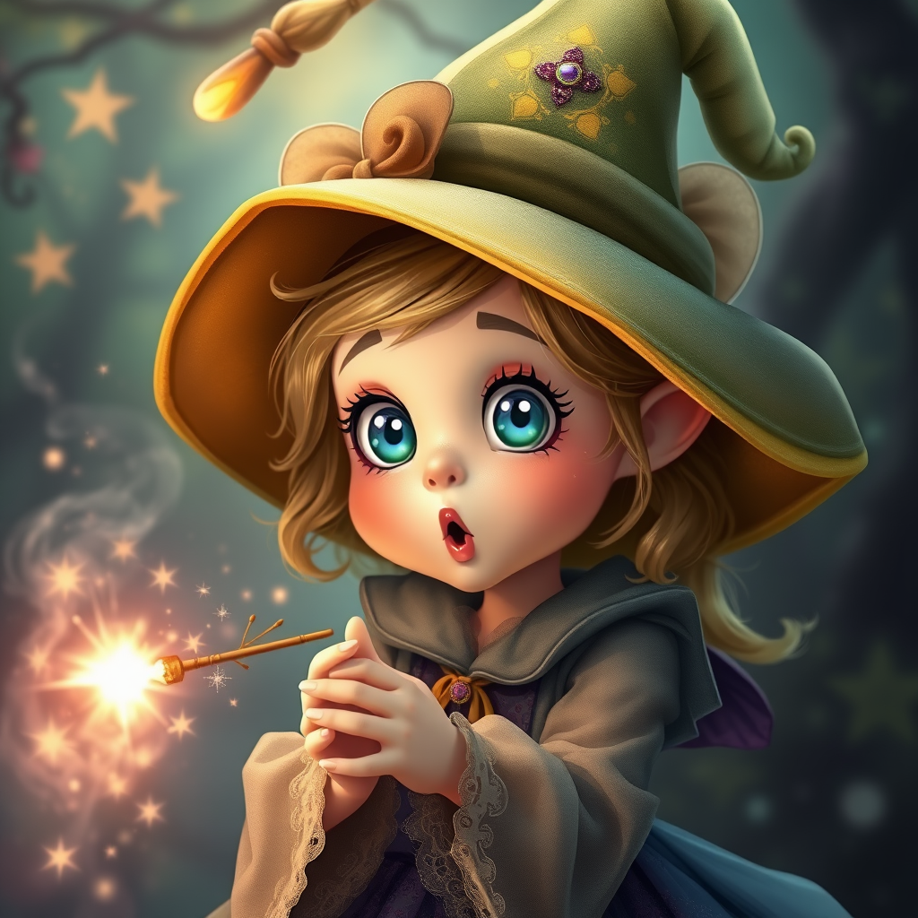 A charming little witch casting a delightful spell, featuring an adorable face with a surprised expression, vibrant colors in a magical scene, enchanting details, whimsical elements, serene background with mystical aura, soft lighting enhancing the enchanting mood, captivating eyes full of wonder, graceful pose, ethereal attire flowing with magic, enchanting sparkles surrounding her wand, a sense of awe and wonder, ethereal glow illuminating her excited expression, a perfect blend of magic and charm, atmospheric and captivating composition.