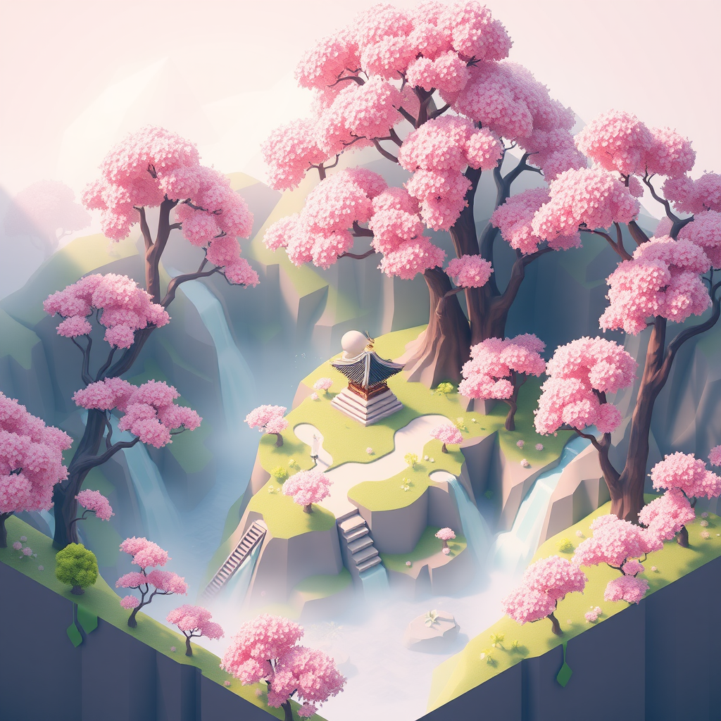 A charming low poly isometric cherry blossom forest island with delicate pink waterfalls and gentle mist, showcasing soft lighting and subtle shadows, reminiscent of Monument Valley and Fez video game, with a serene atmosphere that invites exploration, trending on ArtStation, 3D render. Quietly nestled among the trees is a small, ancient shrine adding a touch of mystery to the idyllic landscape.