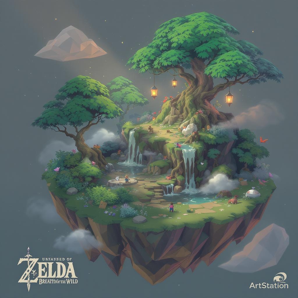 A charming matte low poly isometric scene inspired by Zelda Breath of the Wild, featuring a mystical forest island with cascading waterfalls and ethereal mist, bathed in late afternoon light and adorned with gentle, soft shadows, drawing influences from Monument Valley and Fez video game aesthetics, showcased in a captivating 3D render, trending on ArtStation, enhanced by whimsical floating lanterns and playful wildlife.