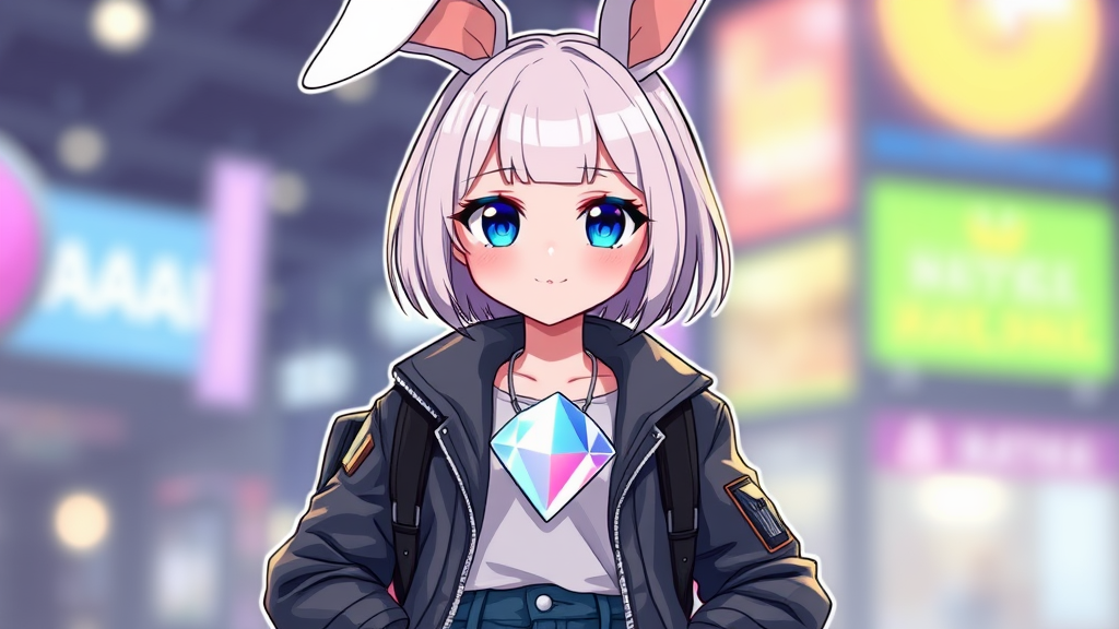 A charming nijigirl with bunny-like ears, sporting a sleek techwear jacket and snug jeans, her hair styled in a soft, milky bob cut that frames her radiant, warm smile. Around her neck rests a striking, oversized diamond necklace, catching the light with every movement. She poses confidently, her cobalt ODD eyes gleaming with a unique allure, while her figure features an impressive silhouette. A functional yet stylish backpack is slung over her shoulder, adding to her futuristic ensemble. Each element is intricately detailed, creating a vivid picture of a character blending whimsical charm with a modern, tech-inspired aesthetic.