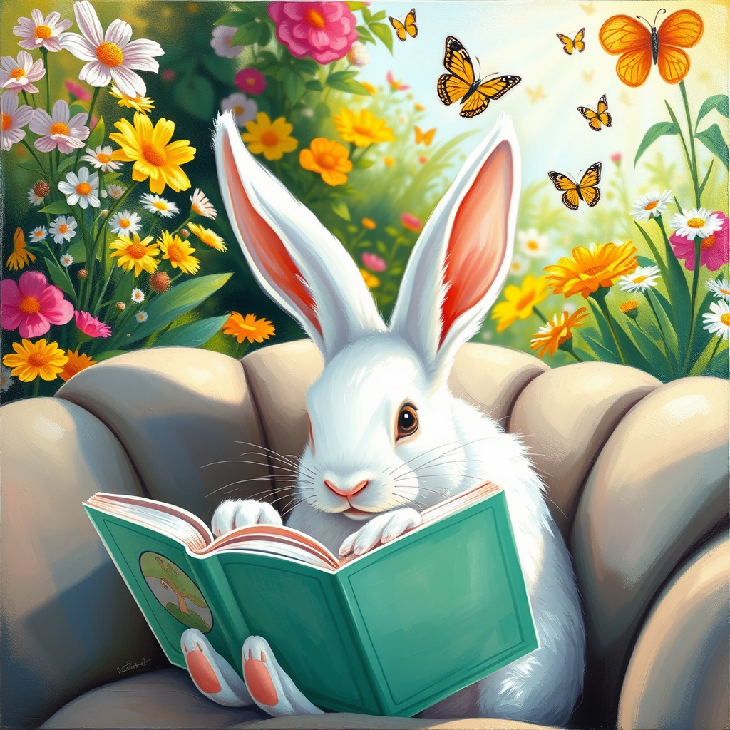 A charming oil painting features a white rabbit with expressive, long ears nestled comfortably on a plush sofa, deeply engrossed in a mint green children's picture book. The scene is painted with a pastel color palette, exuding a cute and cozy warmth. The close-up composition highlights the rabbit's inquisitive face, set against a vibrant garden background where blooming flowers and fluttering butterflies celebrate the essence of spring on a sunny day. The natural sunlight dances across the canvas, infusing the atmosphere with brightness and vitality. The artwork is characterized by delicate, small strokes of oil, capturing the lively spirit of this whimsical moment.