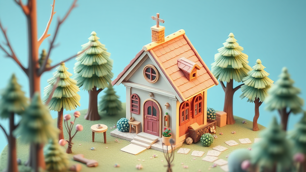 A charming, petite isometric fantasy cottage nestled in the woods, adorned with intricate decorations. The scene is bathed in soft, smooth lighting with gentle pastel colors, captured as if through a 100mm lens. Rendered in 3D using Blender, this piece is trending on polycount for its modular constructivism design against a soothing blue backdrop. Utilizing physically based rendering, it is centered perfectly, enhanced by volumetric lighting. The style is a delightful blend of cartoon and anime, featuring whimsical sketches, low resolution for a nostalgic feel, and normal quality for a dreamy, enchanting ambiance.
