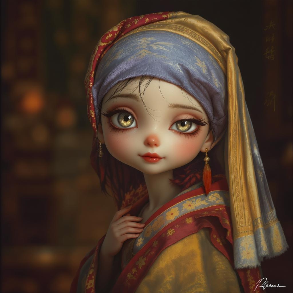 A charming portrait of a chibi character wearing an ornate head scarf, captured in cinematic ambient lighting. The piece is rich in intricate detail, presented in 8k UHD with HDR quality, showcasing vivid and vibrant colors. The character features a cloned face with a slightly whimsical, cross-eyed expression and an elongated neck, with a playful twist of extra fingers on the hands. This artistic creation carries an intentionally mutated, surreal essence, playing with artistic conventions. The image maintains a dreamy and cartoon-like aesthetic, with some blurred areas giving an impressionistic touch. There is a subtle, almost invisible watermark and gentle hints of text or writing, adding layers to the narrative without being obtrusive. Despite evoking a cartoonish charm, the piece retains a high level of artistic sophistication, pushing the boundaries of conventional portraiture with its creative mutations and ornamental design.
