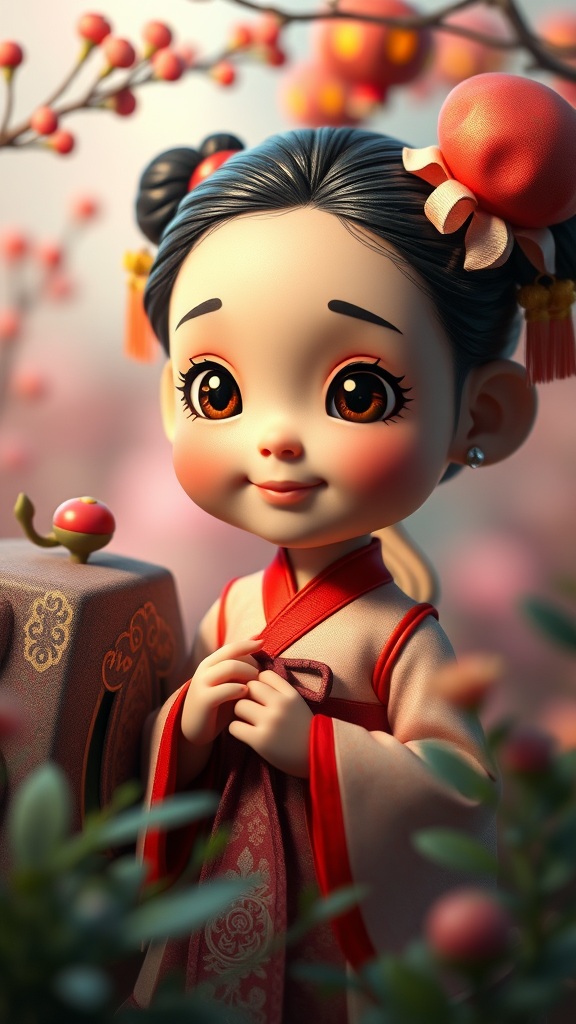 A charming portrayal of a young Chinese girl, blending the hyper-realistic aesthetic of Unreal Engine 5 with the whimsical charm of Disney animation, envisioned as an adorable toy sculpture. Influences of Charles Willson Peale, Jeremiah Ketner, and Mark Ryden add layers of artistic depth, while an Aurorapunk theme infuses it with a mystical, otherworldly allure. The scene captures her in a vibrant, dream-like landscape where her surroundings are bathed in a soft, ethereal glow, highlighting her playful expression and intricate details of her delightful attire, amidst a backdrop that feels both timeless and enchanting.