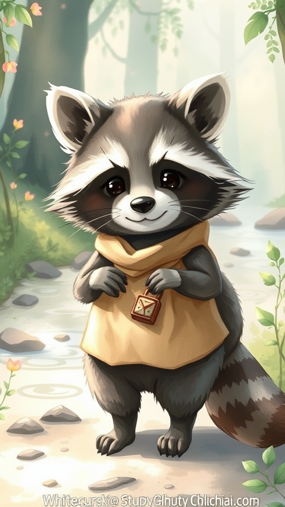 A charming raccoon character exuding a whimsical aura, reminiscent of Studio Ghibli's enchanting art style, stands poised in the soft glow of a serene forest setting. The raccoon's expressive features embody the essence of the Japanese kawaii aesthetic, with delicate fine lines capturing the nuanced textures of its fur. Subtle watercolor effects blend harmoniously, painting the raccoon in gentle earth tones with hints of serene mint and sky blue highlights. In one paw, the raccoon gently grasps a quaint cloth bag, the fabric naturally crumpled, exuding a sense of well-loved adventure. Etched onto the bag is a small, intriguing cube symbol, hinting at mysteries or treasures contained within. The background subtly teems with delicate foliage and softly trickling streams, echoing the calming tranquility of a picturesque woodland scene, while weaving in tender elements of magic and wonder.