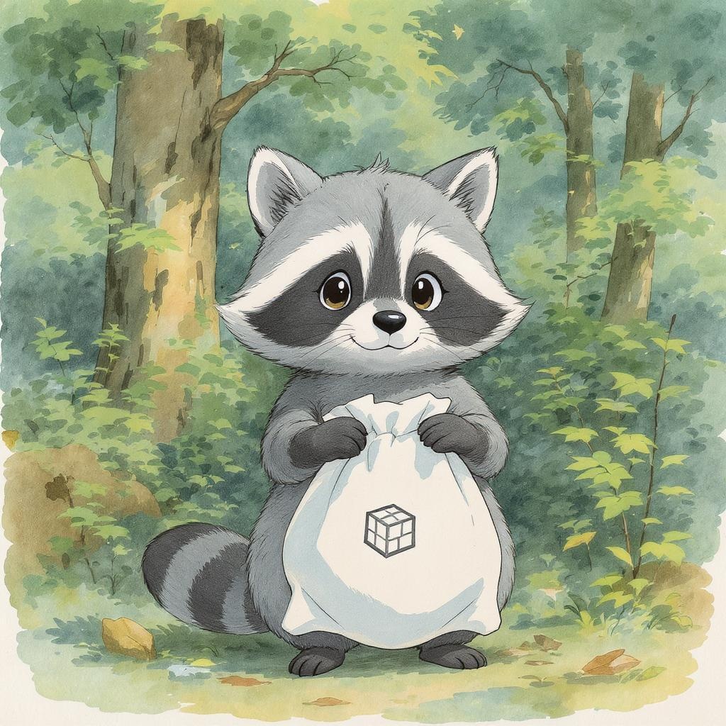 A charming raccoon character stands in a whimsical forest setting, drawn with the delicate, handmade lines reminiscent of Studio Ghibli's enchanting style, infused with elements of kawaii art's endearing charm. The raccoon's expressive eyes and endearing smile add a touch of playfulness, as fine lines and watercolor effects bring to life the lush, serene environment surrounding it, blending various shades of green and earth tones. The raccoon's paws grasp a cloth bag, its texture softly rendered with a gentle watercolor wash. On the bag, a cube symbol is subtly yet distinctly incorporated, harmonizing with the overall design, as gentle hints of light and shadow lend depth and warmth to the scene, evoking a sense of wonder and tranquility.