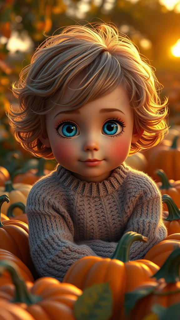 A charming scene captures a delightful little girl in a vibrant pumpkin patch, her short, light brown curls cascading gently around her face. Her enormous, sparkling blue eyes reflect the wonder of autumn. She wears a cozy, knitted sweater, perfectly complementing the warm hues of the season. The setting sun casts a golden glow over her surroundings, illuminating the rich textures of the pumpkins scattered around her. Leaves rustle in the gentle breeze, adding a touch of magic to the air. This Pixar-inspired moment is brought to life with stunning detail and clarity, showcasing the whimsical essence of Disney's storytelling in an 8k octane render Unreal Engine masterpiece.