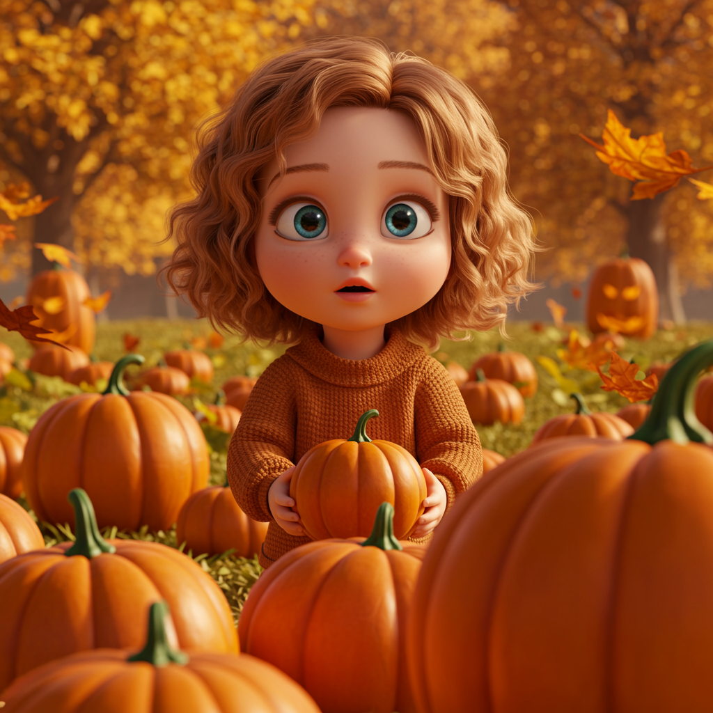 A charming scene from a 3D animated Disney-Pixar inspired movie, capturing an enchanting little girl with short, light brown curly hair at a vibrant pumpkin patch. Her beautiful and expressive face, adorned with huge captivating blue eyes, radiates innocence and wonder. She wears a cozy autumn outfit that complements the warm tones of the fall landscape around her. The pumpkins, in various sizes and shades of orange, add a playful touch to the scenery. The image boasts a visually stunning 8k resolution, created using the Unreal Engine, reflecting an exquisite level of detail and realism. The overall ambiance embraces the warmth and magic of an autumn day with golden leaves gently falling from the trees.