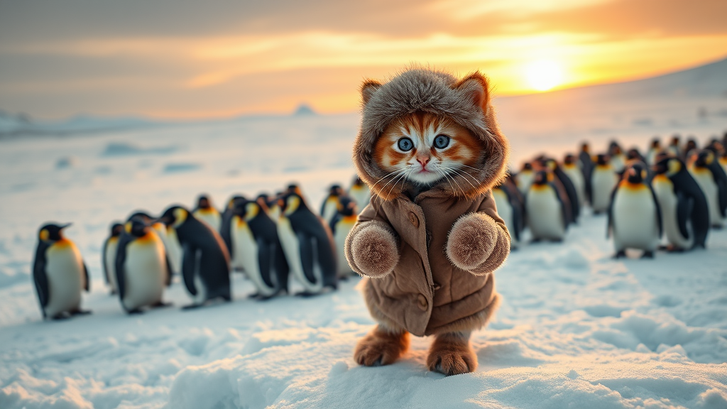 A charming scene unfolds on a vast snow-covered ice field where a playful kitten, dressed warmly in a cozy brown parka and hat with matching mittens, is taking an adorable selfie. The kitten, with its strikingly large eyes and fluffy long fur, stands out amidst a lively gathering of over a dozen petite emperor penguins, their black and white coats creating a striking contrast. The sun sets in the background, casting a golden glow over the landscape, enriching the scene with a serene, hyper-detailed beauty. The playful chatter of the penguins adds life to the setting, as soft snowflakes begin to fall, completing the enchanting winter tableau.