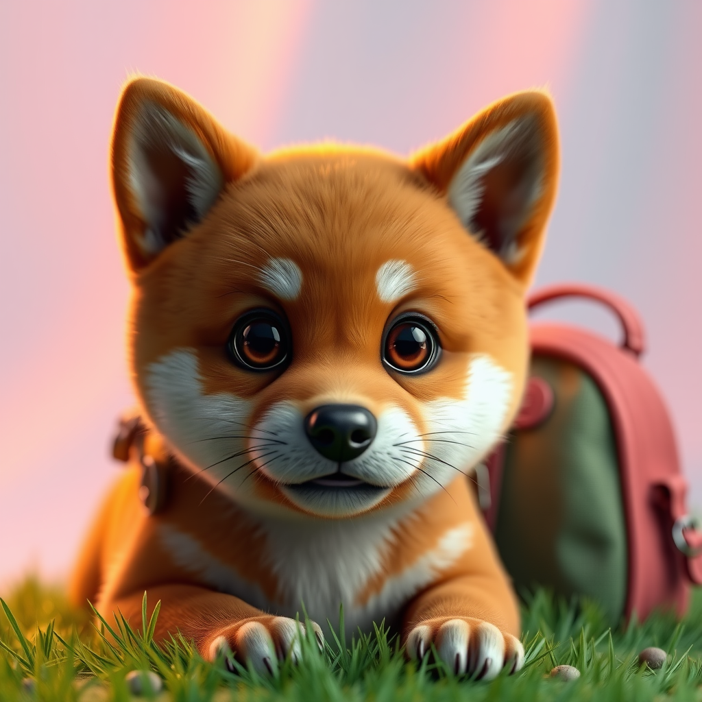 A charming shiba inu puppy with expressive eyes, depicted in a highly detailed 3D octane render in a vibrant yet soothing Fortnite-inspired style, featuring intricate textures and lifelike fur, illuminated by gentle studio lighting that enhances its warmth and playfulness. The color palette consists of soft pastels, giving it a dreamlike quality, while surrounded by whimsical props like a tiny adventure backpack and a miniature grassy play area, all contributing to an ultra-realistic and endearing scene.