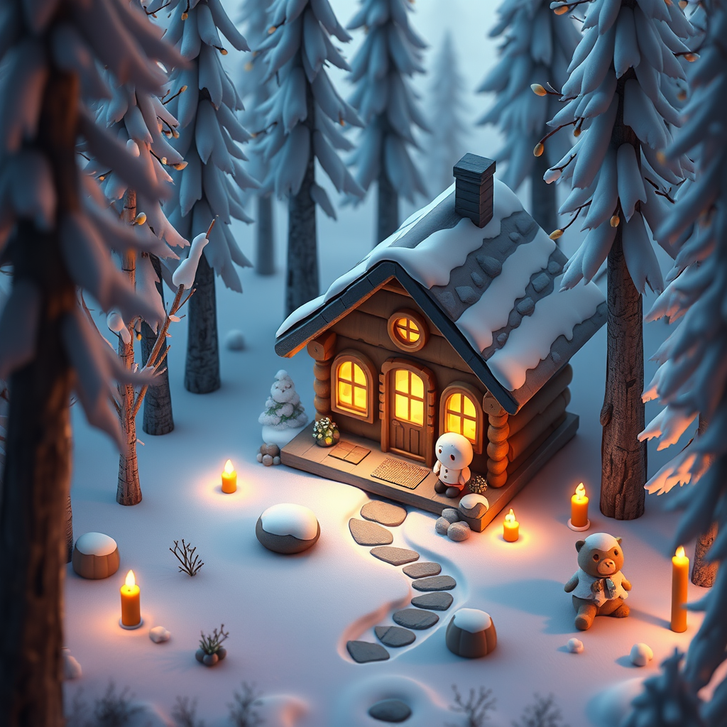 A charming small cabin nestled in a tranquil snowy forest, presented in a low poly render with isometric perspective, drawing inspiration from the art of Andreas Rocha. The scene features stylized character design, with a cozy and inviting atmosphere, enhanced by soft image shading and deep, rich colors. The lighting is high resolution and beautifully captures the ambiance, with a uniquely rounded cabin structure. Accompanying the scene is a cute character, adding warmth to the setting with their presence. The entire composition is bathed in the gentle glow of candlelight, viewed from an extremely detailed frontal angle, with slight creative twists to add a unique flair while maintaining the core concept.