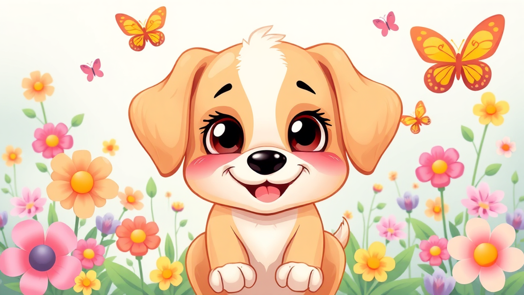 A charming vector illustration of an adorable puppy with big, bright eyes, happily grinning at the viewer, surrounded by a playful backdrop of colorful flowers and butterflies, capturing a whimsical and cheerful cartoon vibe.