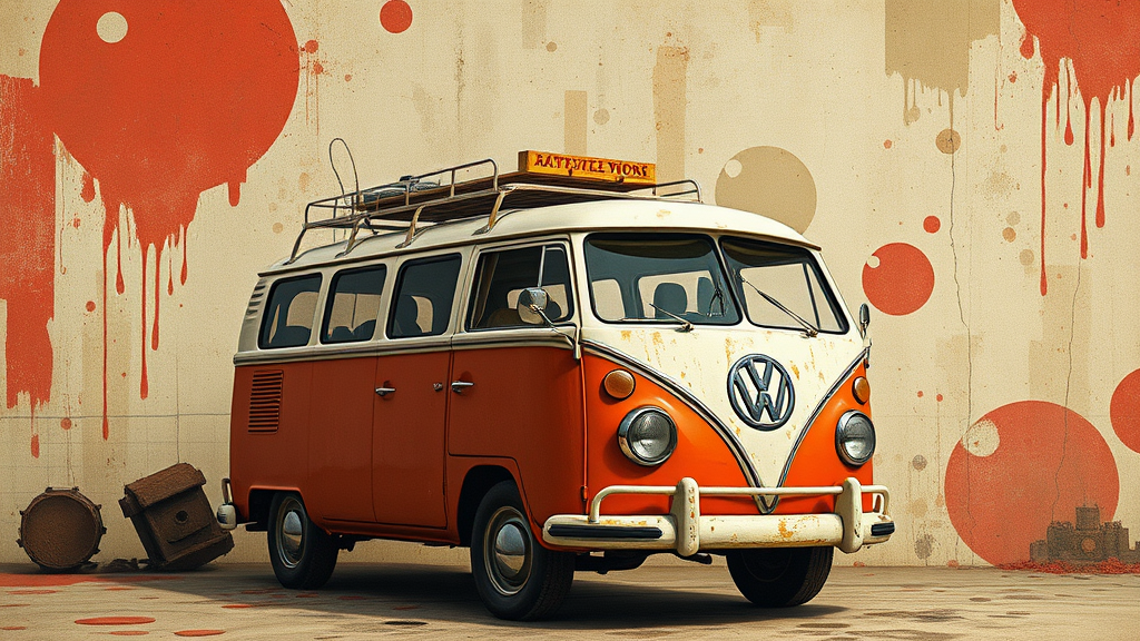 A charming vintage VW bus is set against a canvas backdrop with abstract elements in light red and light brown hues. The scene is infused with a whimsical, character-driven style reminiscent of Brian Mashburn's intricate details and Theo Prins' enchanting illustrations. Inspired by Pierre Pellegrini, the composition feels like a nostalgic journey, blending rustic cut-and-paste aesthetics with hints of rusty debris in the background, capturing a timeless, imaginative essence.