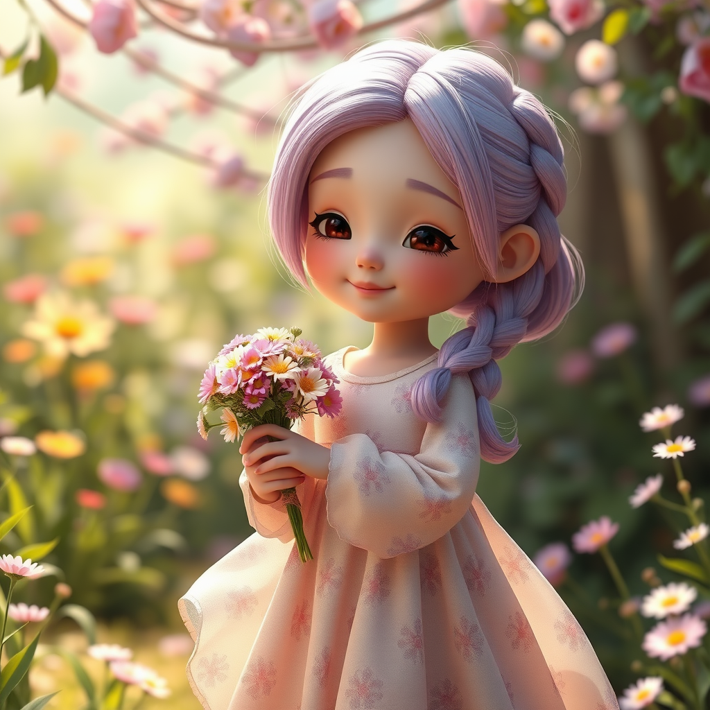 A charming, warm-hearted young girl with side braid lavender hair, round face, gentle smile lines, compassionate expression, wearing a flowing dress adorned with delicate floral patterns and elegant sandals, tenderly holding a bouquet of wildflowers, radiating empathy and care, IP character, 3D C4D, 8K, OC renderer, blind box, top-tier quality, cinematic lighting, high contrast, intricate detail, art, award-winning composition, UHD, 3D rendering, set in a whimsical garden under dappled sunlight in a dreamlike atmosphere, with subtle breeze animation, style evocative and picturesque.
