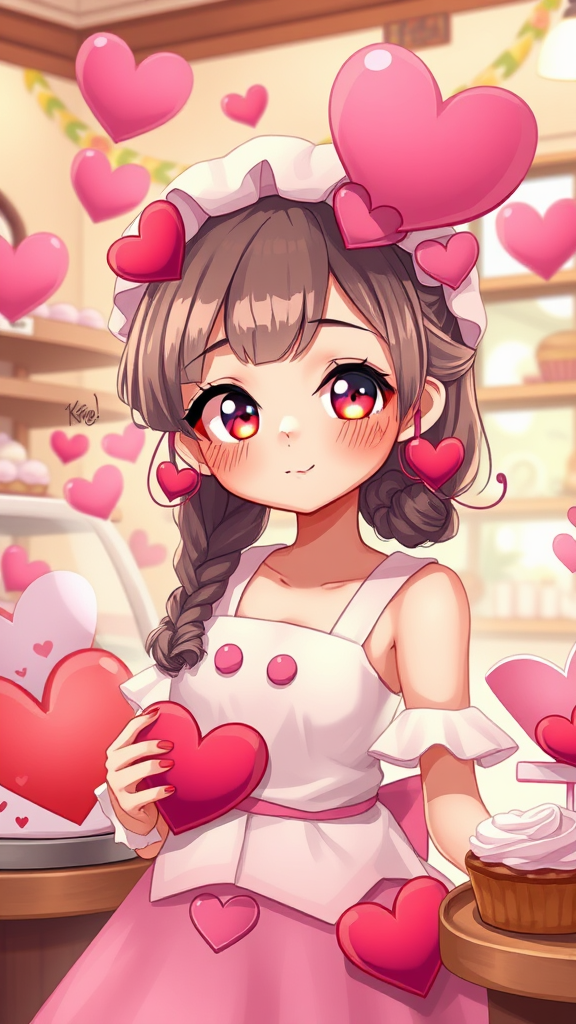 A charming, whimsical girl embodying Valentine's Day, depicted in a highly detailed digital illustration blending the styles of Artgerm and Studio Ghibli, set in a cozy bakery inspired by Alexei Vinogradov. She has an aura of sweetness, with heart-shaped motifs subtly integrated into her attire and accessories, glowing with warmth and affection. Her eyes sparkle with a mischievous twinkle, reflecting a spectrum of pink and red hues. The bakery setting is vibrant and inviting, with the enticing aroma of freshly baked goods wafting through the air. A vivid, romantic palette with a playful touch captures the essence of love and joy, enhanced by sharp focus and intricate textures, evoking the enchanting worlds of DeviantArt and ArtStation.