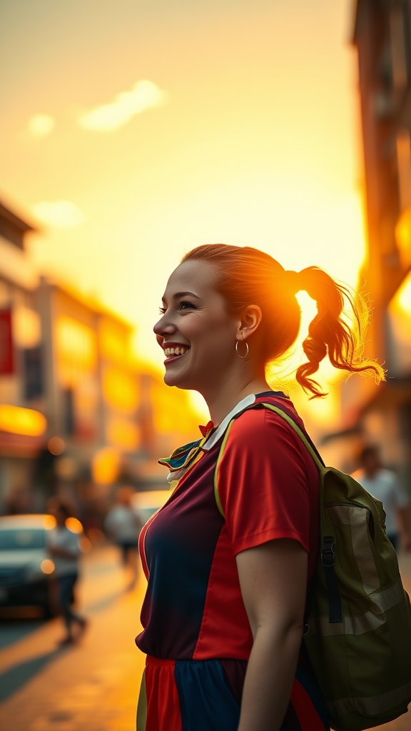 A charming woman with pigtail hairstyle, dressed in a colorful harlequin outfit, joyfully strolled through the vibrant city streets under a brilliant sunset. Her radiant smile mirrored the happy glow of the evening sky. Captured from a side view, the scene was bathed in warm, volumetric lighting, reminiscent of a nostalgic polaroid photo, highlighting the playful essence of a cute clown savoring life's simple pleasures.