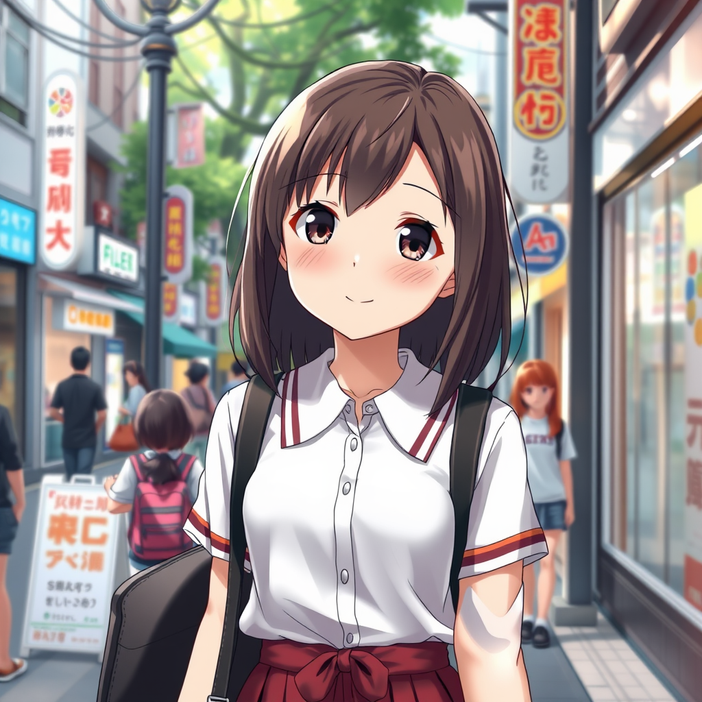 A charming young anime girl strolls casually down a bustling street, donning a neatly pressed school uniform, her features brought to life in stunningly smooth, realistic 3D anime art. Her expressive eyes and gentle smile radiate a captivating warmth, reflecting a sense of youthful curiosity. The scene is painted with the expertly crafted touch of an anime painter studio, capturing the essence of a visual novel's key visual. Her schoolgirl attire sways lightly as she walks, adding a dynamic sense of movement to the artwork. The surrounding environment is alive with vibrant colors and intricate details, transporting viewers into a beautifully realized anime world.