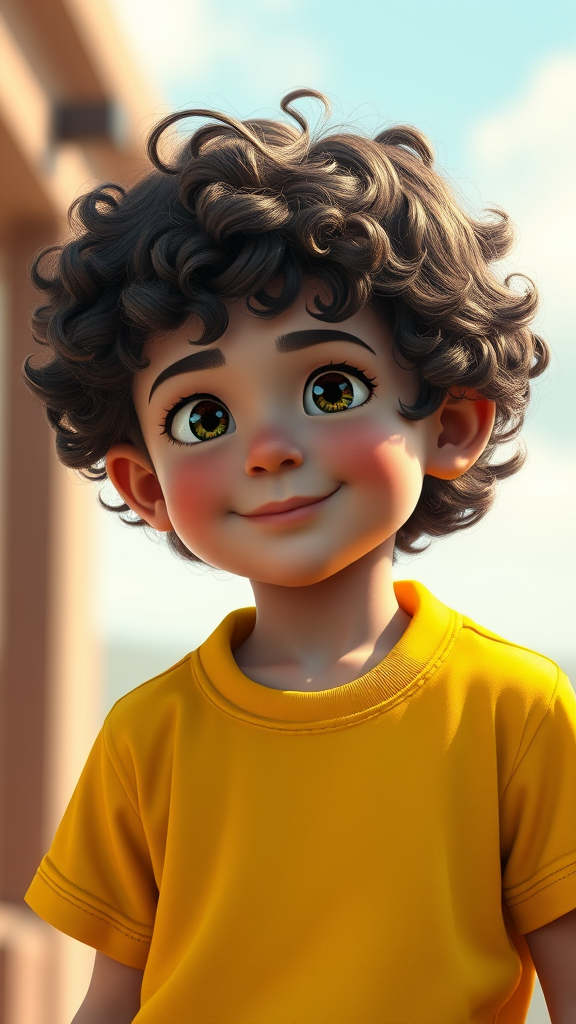 A charming young boy with curly hair sporting a bright yellow shirt, crafted in a stunning cinema4d style with vibrant, captivating details reminiscent of Rudolph Belarski's art. The scene bursts with blink-and-you-miss-it intricacies and dramatic shading, creating a mesmerizing blend of cartoonish caricature and artistic elegance. Let the beauty of the composition captivate with its narrative depth and engaging visual appeal, enhanced by a sense of playful wonder and meticulous stylization.