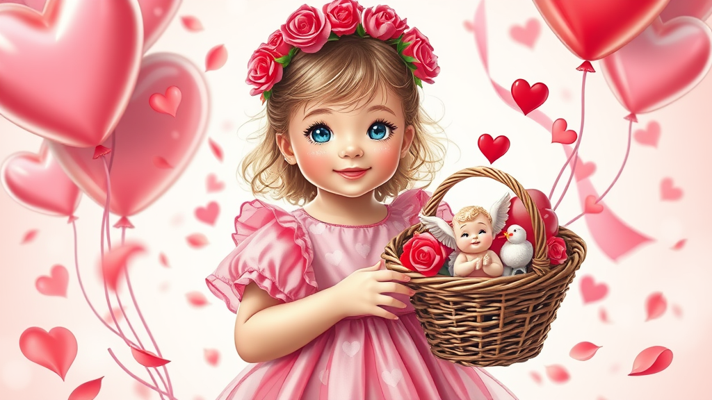 A charming young girl embodying the spirit of Valentine's Day, adorned in a rosy pink dress embellished with delicate heart patterns. Her sparkling eyes mirror the shimmer of love, and she wears a crown of blooming red roses. Playfully, she holds a basket overflowing with cupid’s arrows and fluffy, cloud-like cherubs. Her gentle smile radiates warmth, as she stands amidst swirling petals and floating heart-shaped balloons, creating an enchanting aura of affection and joy.