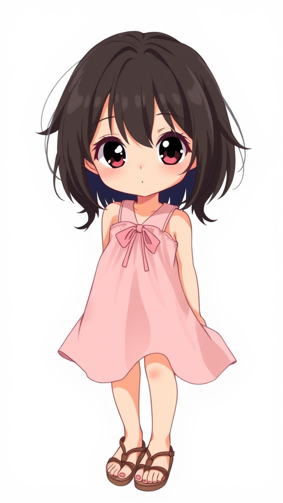 A charming young girl with expressive, large anime eyes and deep ebony hair, adorned in a pastel pink sundress that flows gently around her, complemented by delicate, strappy sandals that add a playful touch to her ensemble.