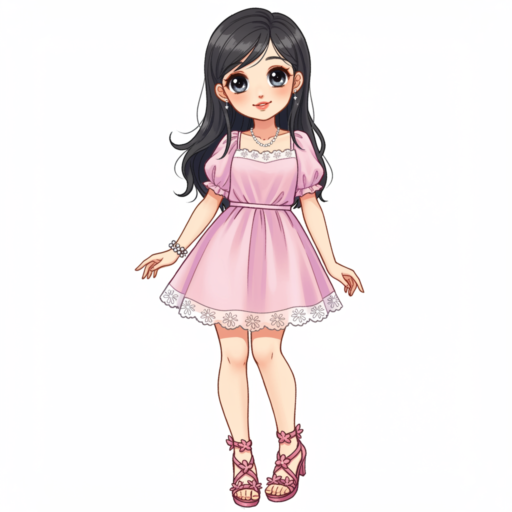 A charming young girl with expressive, oversized anime eyes and flowing dark hair cascading down her shoulders, dressed in a playful, light pink dress accented with delicate lace trim. She's wearing strappy, flower-embellished sandals that perfectly complement her outfit, and her smile radiates warmth and cheerfulness. Her ensemble is completed with a subtle touch of sparkling jewelry, adding a hint of whimsy to her delightful appearance.