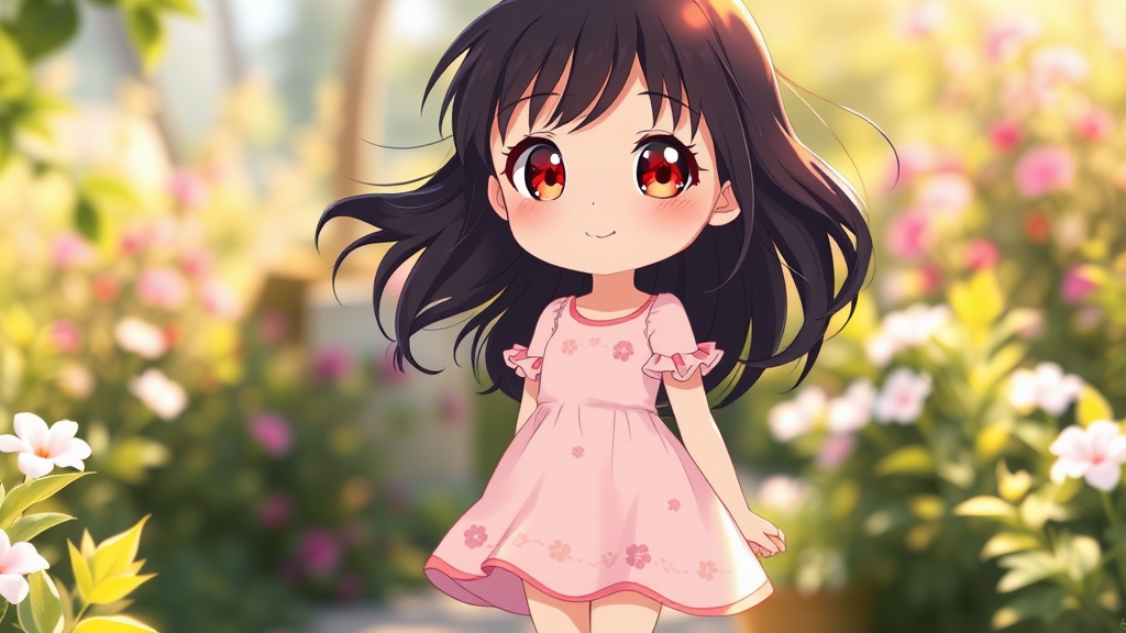 A charming young girl with large, luminous anime-style eyes and flowing dark hair, wearing a pastel pink dress adorned with delicate floral patterns and simple, elegant sandals. Subtle hints of mischief spark in her eyes as she stands poised in a serene garden, the sunlight dancing around her, highlighting her gentle smile and the soft fabric of her dress.