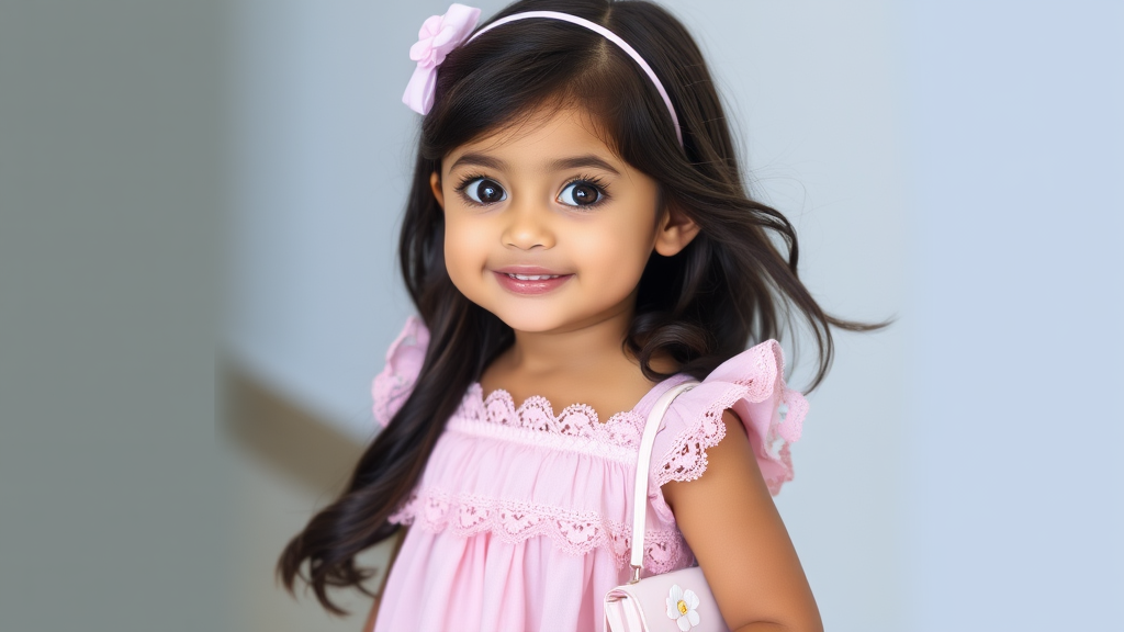 A charming young girl with large, sparkling eyes and dark, flowing hair wears a pastel pink dress adorned with delicate lace trim. Her outfit is completed by a pair of white sandals with little flower accents, and she carries a small, matching purse that adds a hint of playful elegance. Her cheerful demeanor and the slight blush on her cheeks make her presence both vibrant and endearing.