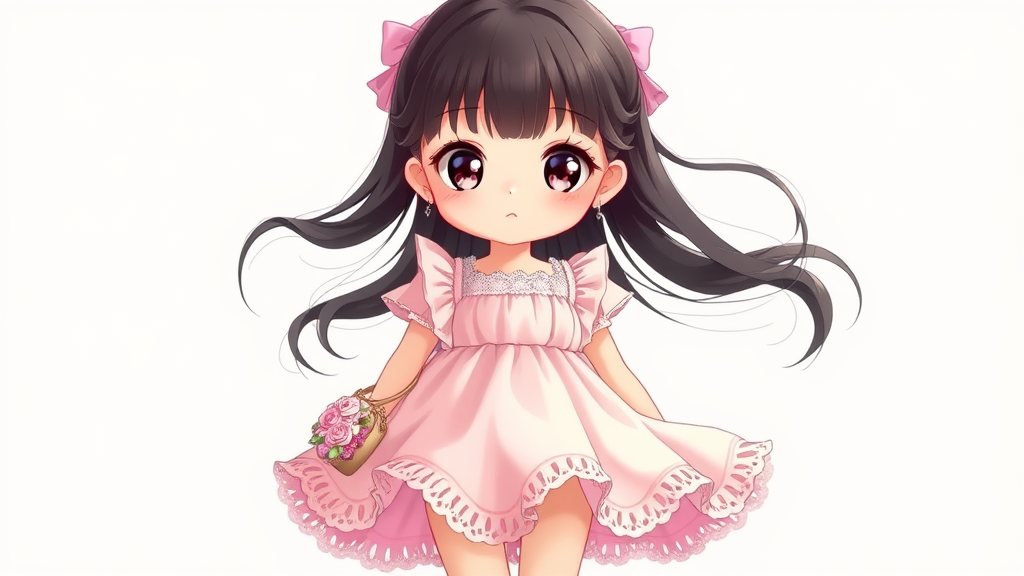 A charming young girl with sparkling, oversized anime eyes and flowing dark hair cascading in gentle waves, wearing a pastel pink dress adorned with delicate lace trim and playful ruffles. Her feet are comfortably nestled in stylish, strappy rose-colored sandals, completing her sweet and whimsical appearance as she carries a small floral handbag, adding a touch of enchanting elegance to her overall look.