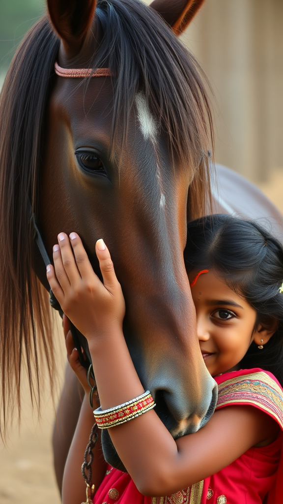 A charming young Indian girl gently embraces the face of a graceful horse, their serene connection captured in a moment of pure affection, the girl's vibrant attire contrasting beautifully with the horse's sleek, flowing mane.