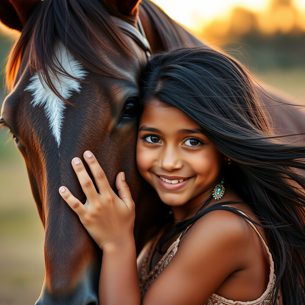 A charming young Indian girl with flowing dark hair gently embraces the majestic head of a horse, her eyes sparkling with joy and connection under the soft glow of the setting sun.