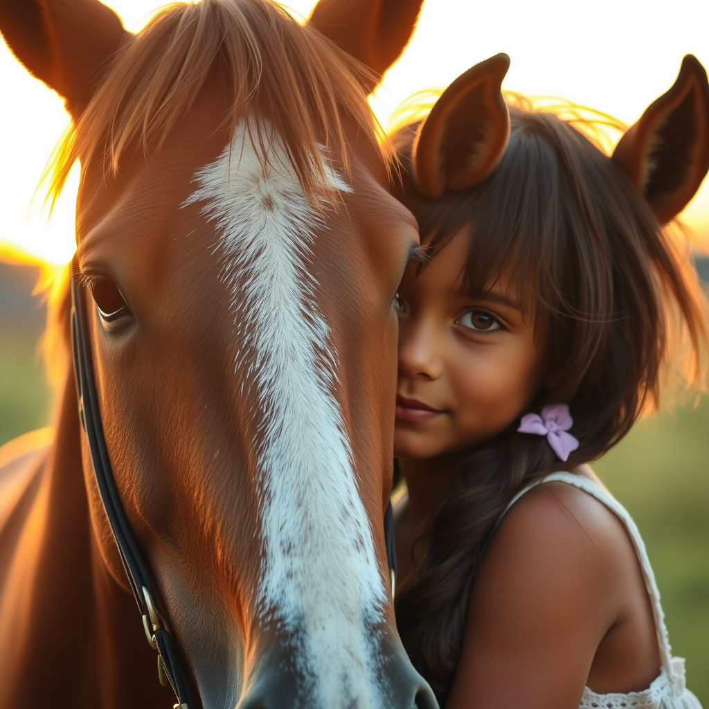 A charming young Indian girl with sparkling eyes gently embraces the head of a majestic horse, their affectionate bond illuminated by the warm glow of the setting sun.
