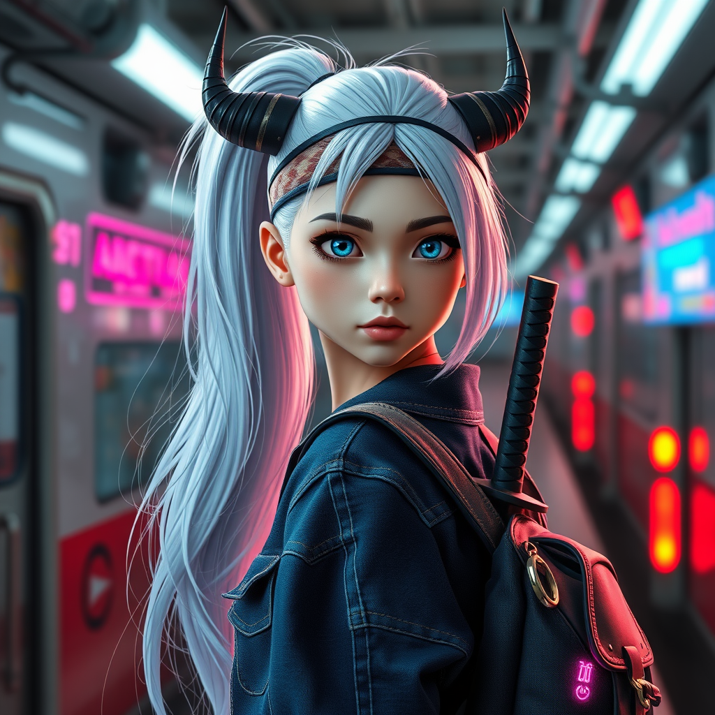 A charming young woman with flowing white ponytail hair adorned with a sleek horned headband, donning a midnight-blue denim jacket. She carries a backpack subtly concealing a katana, her striking blue eyes exuding a mysterious glint. Set against a cyberpunk-themed subway backdrop, the scene is captured in hyperrealistic detail, reminiscent of an 8k render from an Unreal Engine project. The vibrant, expressive style enhances her enigmatic presence, as neon lights dance around in a 3D-rendered urban landscape.