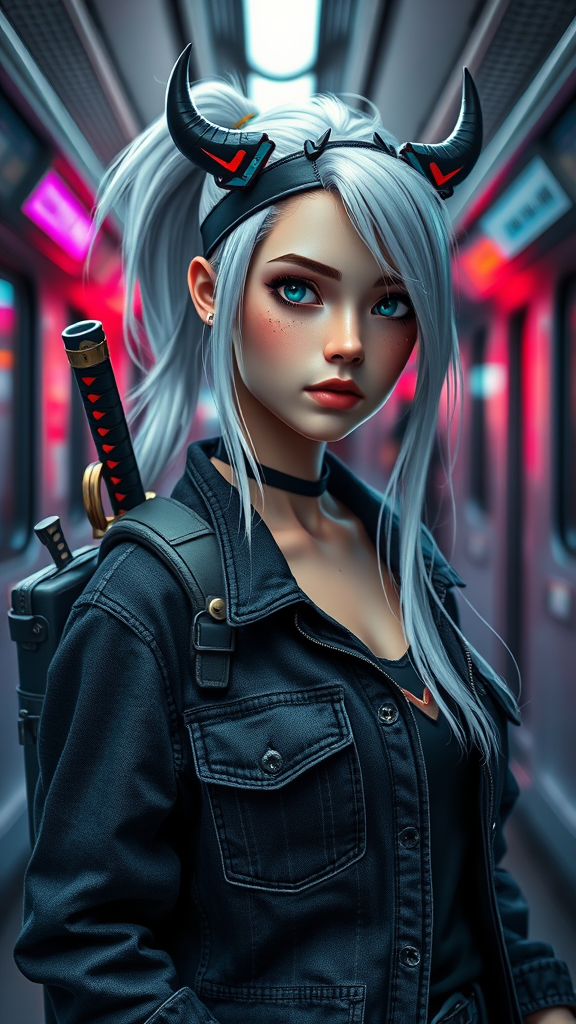 A charming young woman with long, white hair styled in a ponytail, a headband adorned with small horns, wearing a sleek black denim jacket. She carries a backpack fitted with a katana. Her bright blue eyes exude a sense of intrigue. Set in a cyberpunk-themed subway, the scene is captured in hyperrealistic detail with lifelike textures, evoking a photorealistic allure. The setting is rendered in 8k resolution, utilizing unreal engine technology for a high-fidelity 3D appearance. The environment has a dynamic, expressive style with vibrant neon lights adding to the futuristic ambiance.