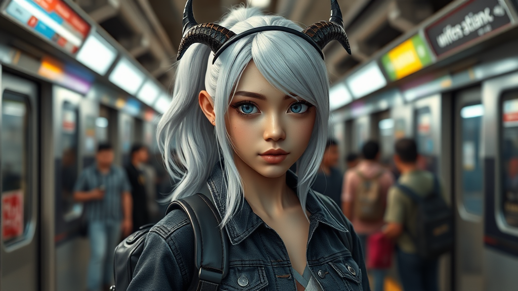 A charming young woman with lustrous, ponytailed white hair adorned with a sleek horn headband, wearing a stylish dark denim jacket. She carries a backpack that subtly houses a katana. Her striking blue eyes pierce through the vibrant cyberpunk atmosphere of a bustling subway station. The imagery is hyperrealistic and photorealistic, captured in stunning 8k resolution, designed with the precision of Unreal Engine and the depth of a 3D render. The scene is portrayed in a portrait aspect ratio, adding a modern and expressive flair to her enigmatic presence.