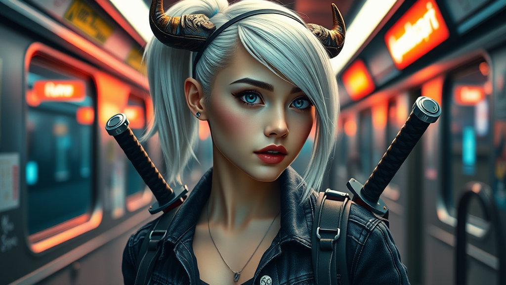 A charming young woman with sleek, white hair styled into a ponytail, sporting a horn-adorned headband. She wears a tailored dark denim jacket and carries a backpack equipped with a gleaming katana. Her striking blue eyes reflect the vibrant lights of the cyberpunk-inspired subway setting around her. The scene is captured in hyperrealistic detail, reminiscent of an 8k, unreal engine 3D render. The atmosphere is infused with an expressive style, invoking a sense of dynamic energy and futuristic allure.