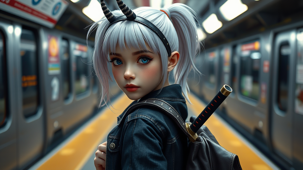 A charming young woman with vibrant white ponytailed hair and a horn headband, dressed in a sleek dark denim jacket, carries a backpack with a visible katana handle peeking out. Her striking blue eyes glimmer within a cyberpunk-themed subway setting, captured in hyperrealistic and photorealistic detail. The scene is rendered in 8k using unreal engine, showcasing a 3d rendered environment. The composition is in a 9:16 aspect ratio, with an expressive style and a touch of creativity that brings this futuristic world to life, enhancing the character's vibrant aura.