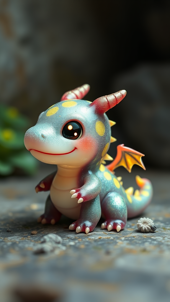 A charmingly adorable dungeon slime with a playful, chibi-like dragon form, featuring bright, shimmering scales and a mischievous spark in its eyes. The creature's small, round body is a delightful blend of soft, jelly-like textures and tiny, wiggling wings, emanating a gentle glow that lights up its surroundings with a cheerful, magical aura.