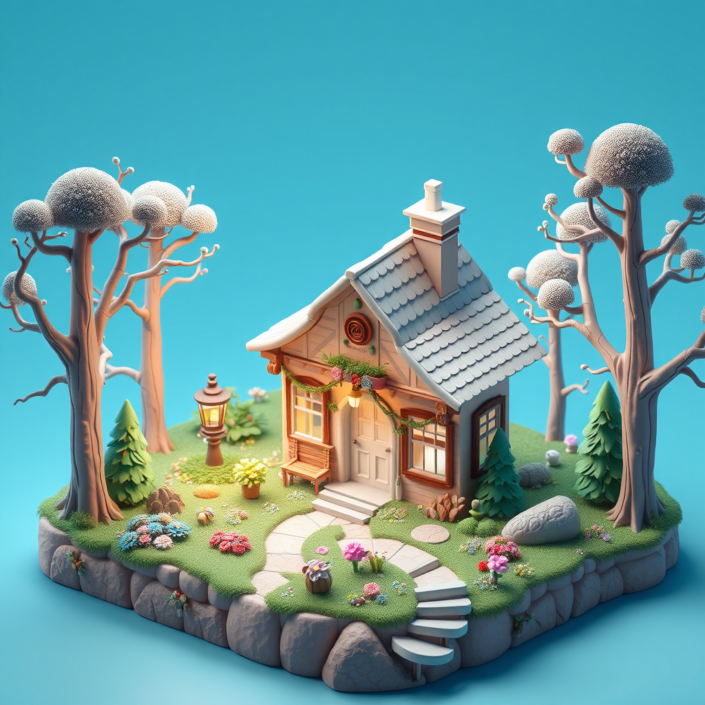A charmingly detailed isometric fantasy cottage nestled in a whimsical forest, featuring intricate decorations and enveloped in gentle, smooth lighting. The scene is rendered with soft, pastel colors, using a 100mm lens and a 3D Blender render technique. The design is inspired by trending modular constructivism on Polycount, set against a serene blue background. Enhanced by physically based rendering, the composition is perfectly centered and adorned with volumetric light effects. The aesthetic blends elements of both cartoon and anime styles, with sketch-like details adding texture. Rendered in low to normal resolution, this cozy cottage exudes warmth and fantasy in every frame.