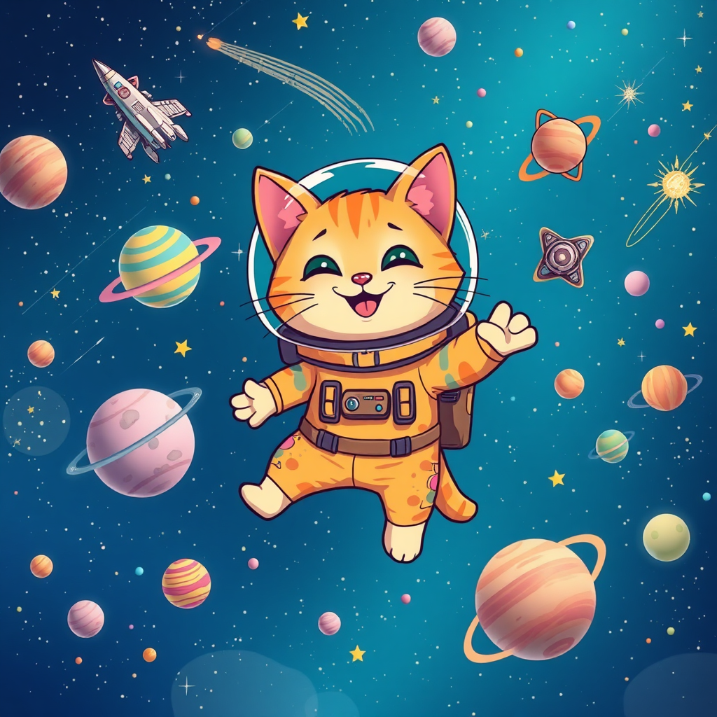 A cheerful, adorable cat in a brightly colored space suit is happily floating amidst the vast cosmos. The cat's suit is adorned with an array of patterns and hues, enhancing its charming appearance. Surrounding this feline adventurer, a mesmerizing cartoon-style galaxy unfolds, with exotic planets of various sizes and colors dotting the scene, interspersed with twinkling stars. The vibrant backdrop includes sleek, whimsical spaceships zooming past and dazzling comets streaking across the sky, infusing the scene with a playful, futuristic vibe. This cosmic wonderland is brimming with vivid details and spirited colors, creating a joyous and imaginative atmosphere.
