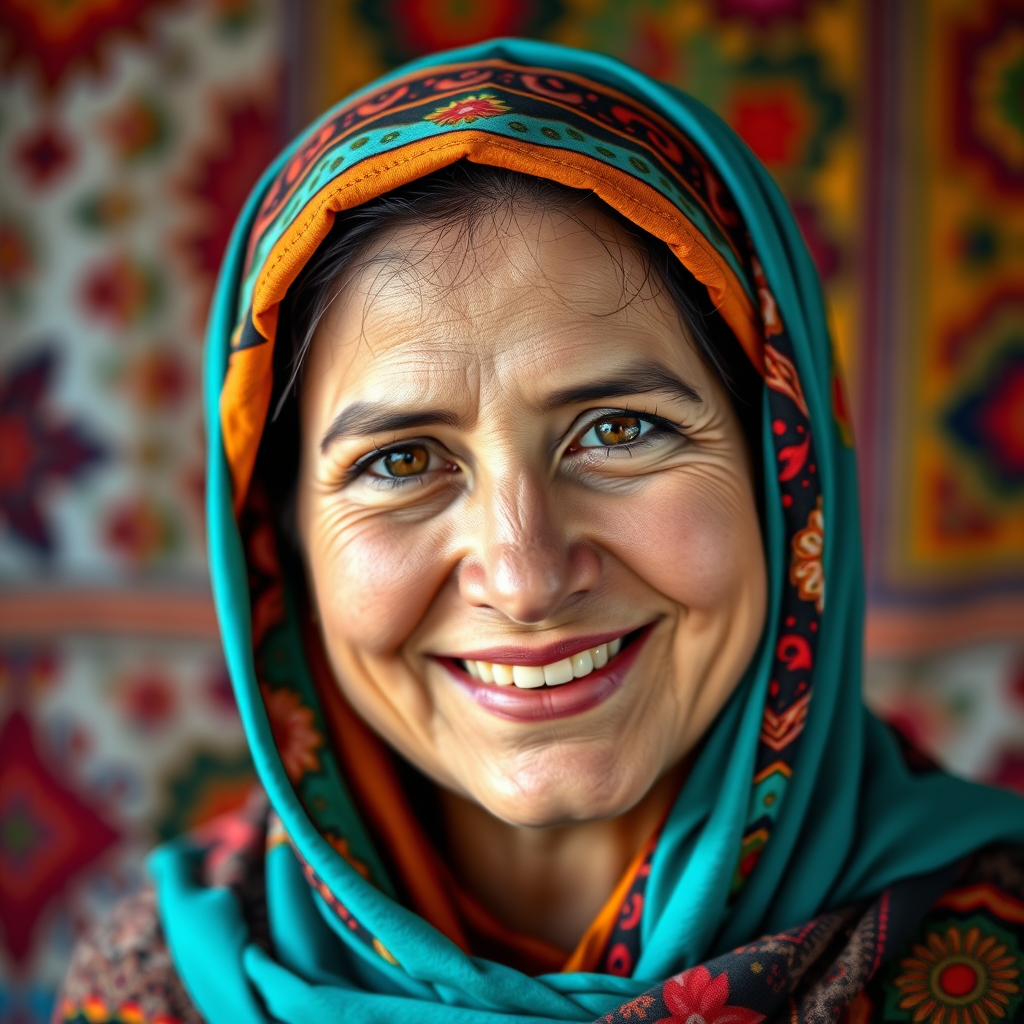 A cheerful Afghan woman wearing a brightly colored hijab, her eyes sparkling with warmth and kindness, exudes confidence and resilience against a backdrop of vibrant cultural patterns.